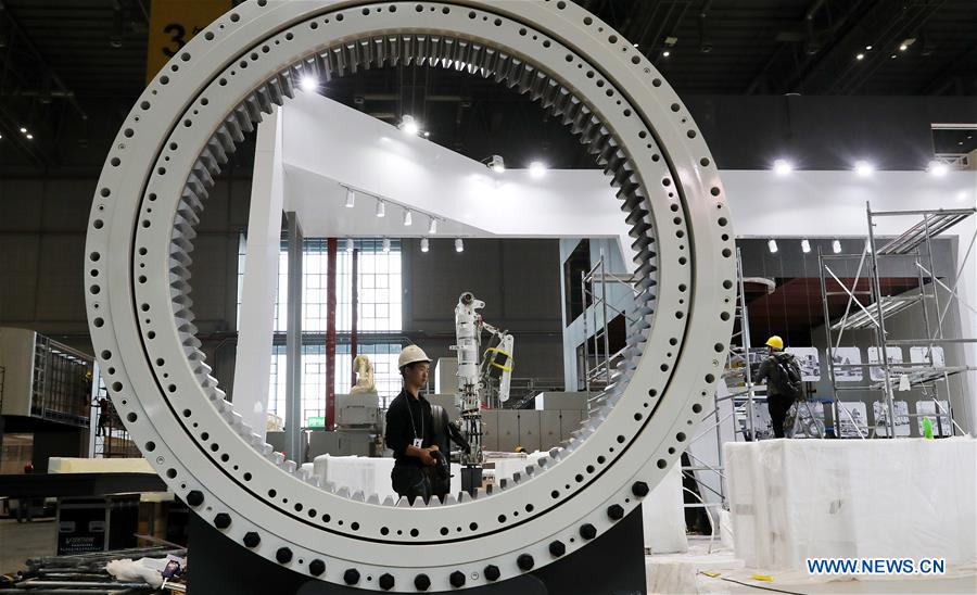 Workers install exhibits at an exhibition hall in the National Exhibition and Convention Center (Shanghai) in Shanghai, east China, on Oct. 30, 2018. The living and working scenes of Chinese people in the past year have created a series of amazing views, some of which formed geometric figures. Those photos tell the development and progress of the country in 2018. (Xinhua/Fang Zhe)