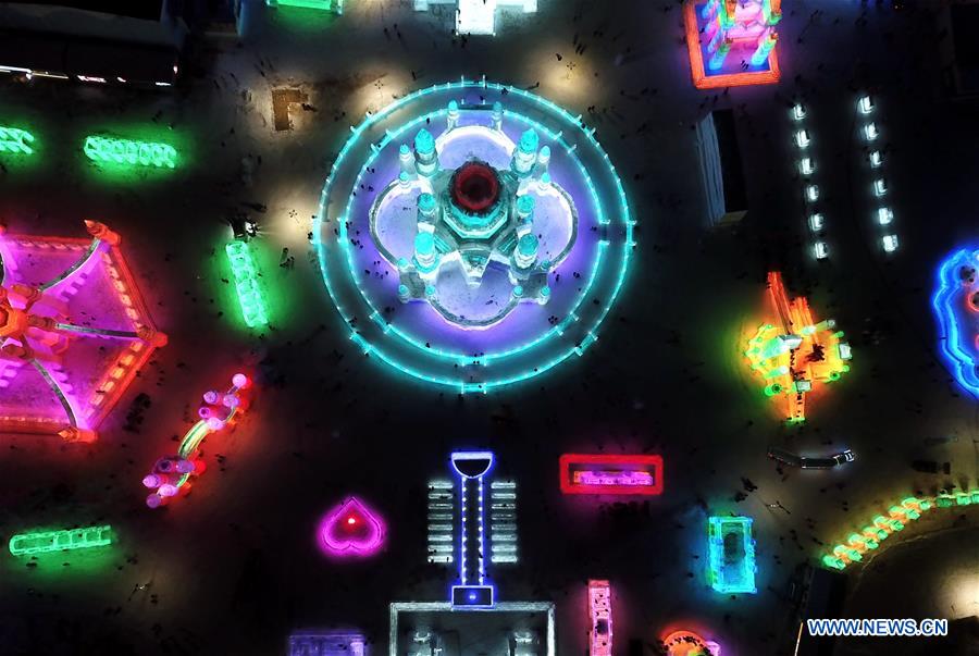 Aerial photo shows a view of the Ice-Snow World in Harbin, capital of northeast China's Heilongjiang Province, Dec. 23, 2018. The Ice-Snow World opened on Sunday in Harbin. Covering an area of 600,000 square meters, the park used 110,000 cubic meters of ice and 120,000 cubic meters of snow this year. (Xinhua/Wang Song)