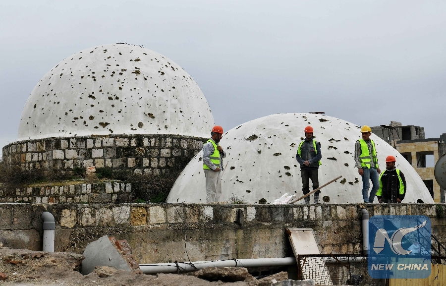 Workers carries out the rehabilitation work at the Souk al-Saqatiyya in Aleppo, northern Syria, on Dec. 19, 2018. (Xinhua/Ammar Safarjalani)