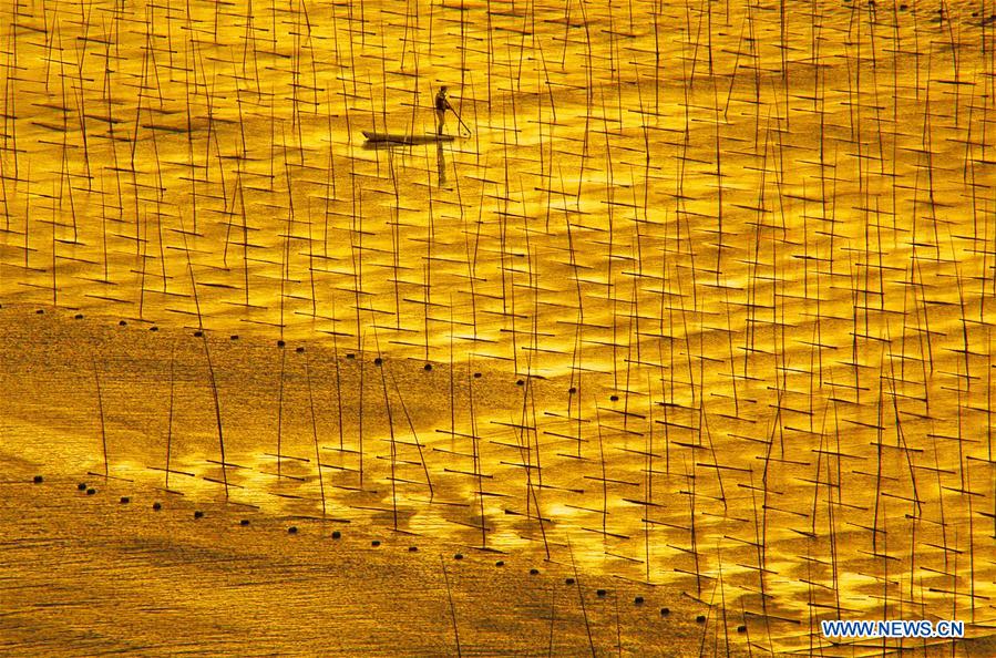 A man works at a laver cultivation base in Xiapu County, southeast China's Fujian Province, Oct. 24, 2018. (Xinhua/Pan Zhengguang)