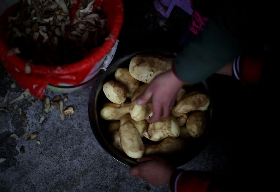 Girls place peeled potatos for cooking during lunch time at Haoba central school in Junlian County of Yibin City in southwest China's Sichuan Province, on Dec. 8, 2018. As lodging students, the players have to cook for themselves during weekends. Situated in the vast Wumeng Mountains of southwest China's Sichuan Province, Haoba central school is a nine-year school providing primary education and middle school education, just like other schools in this mountain area. However, a basketball team formed by female students made the school quite famous in its township, even in neighboring cities. The team was founded in 2005 by Fan Qingang, a 46-year-old teacher who used to teach Chinese in Haoba central school. As the coach of the team, Fan not only teaches the girls to play basketball but also tries to help them develop a habit of exercising and a healthy life. Up to now, this team has won 10 champion titles in different regional basketball games for middle school students. "I hope that in the future, the students here will be given more opportunities to participate in basketball, football and other sports, because sports will offer them more chances to walk out of the mountains and broaden their horizon," Fan said. (Xinhua/Liao Yujie)