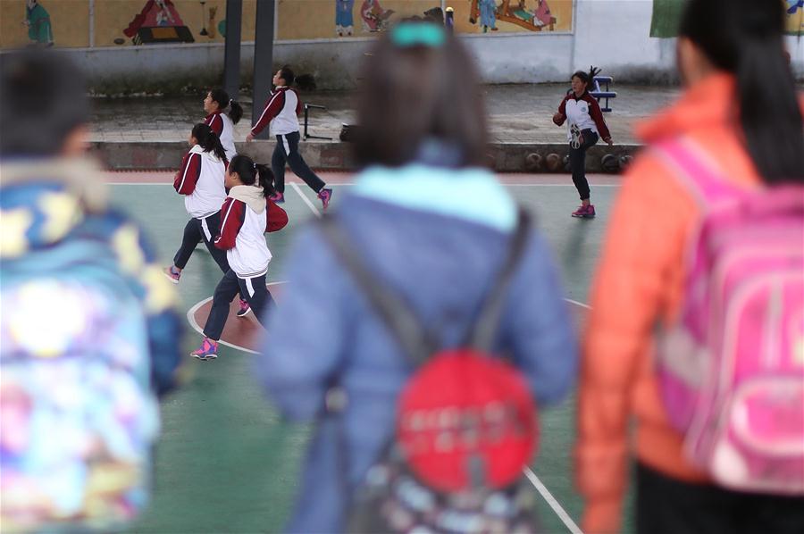 Girls of the basketball team participate in a training session at Haoba central school in Junlian County of Yibin City in southwest China's Sichuan Province, on Dec. 7, 2018. Situated in the vast Wumeng Mountains of southwest China's Sichuan Province, Haoba central school is a nine-year school providing primary education and middle school education, just like other schools in this mountain area. However, a basketball team formed by female students made the school quite famous in its township, even in neighboring cities. The team was founded in 2005 by Fan Qingang, a 46-year-old teacher who used to teach Chinese in Haoba central school. As the coach of the team, Fan not only teaches the girls to play basketball but also tries to help them develop a habit of exercising and a healthy life. Up to now, this team has won 10 champion titles in different regional basketball games for middle school students. "I hope that in the future, the students here will be given more opportunities to participate in basketball, football and other sports, because sports will offer them more chances to walk out of the mountains and broaden their horizon," Fan said. (Xinhua/Liao Yujie)
