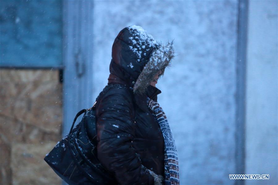 A woman waits at a bus station in a windy snow in Bucharest, Romania, on Jan. 15, 2019. A heavy snowfall hit the southern Romania, including Bucharest, capital of this country, on Tuesday. The morning snow created delays in transport and made commuters arrive late at work. (Xinhua/Gabriel Petrescu)