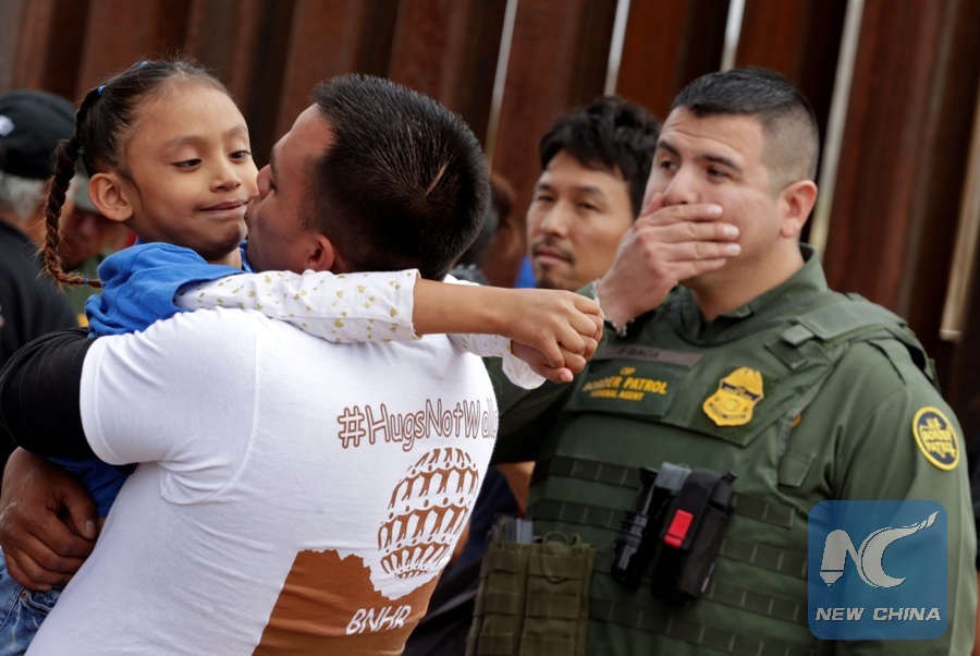 File Photo: A man embraces a child as a U.S. border patrol federal agent reacts during a brief reunification meeting of relatives separated by deportation and immigration called "Hugs, No Walls," at the borderfence between Mexico and the U.S. in Ciudad Juarez, Mexico Oct. 13, 2018. (Xinhua/REUTERS)