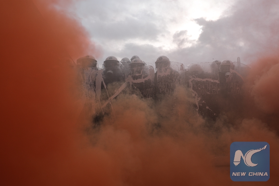 Greek riot police clash with protesters during a protest against the Macedonia name deal in Athens, Greece, on Jan. 20, 2019. A mass rally held in front of the Greek parliament in Athens over the Macedonia name deal was marred by violent clashes on Sunday. Syntagma Square was converted into a battlefield when hooded protesters, trying to get into the parliament's courtyard, threw rocks and firebombs at riot police. Police forces used tear gas to repel the attempt. (Xinhua/Lefteris Partsalis)