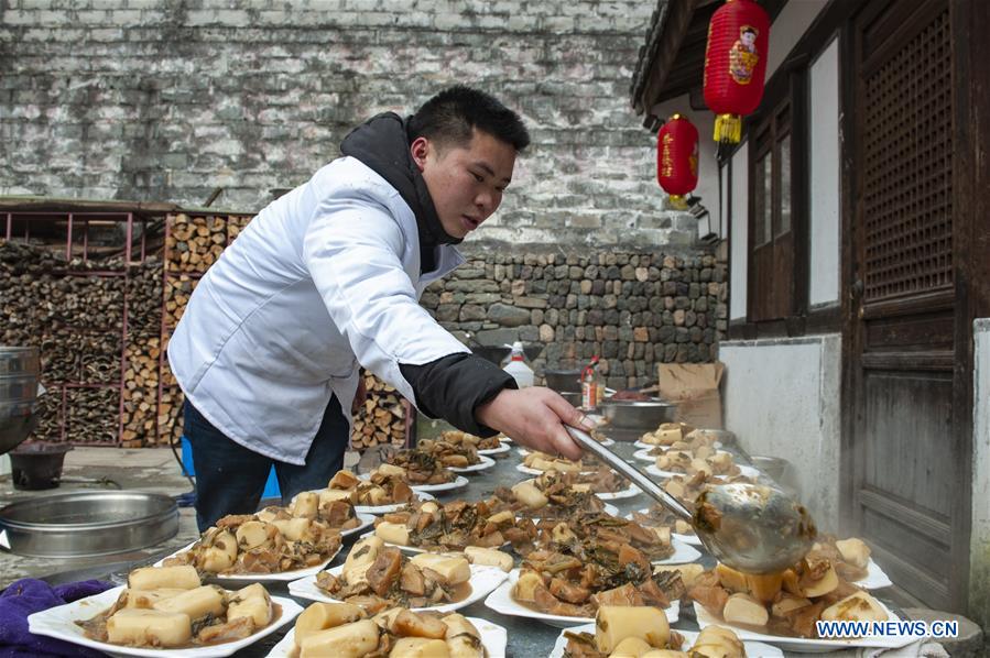 A villager prepares a long-table banquet at Zhongcun Village of Yuyao, east China's Zhejiang Province, Jan. 26, 2019. Tourists took part in folk activities together with local villagers in celebration of the Spring Festival, or the Chinese Lunar New Year, which falls on Feb. 5 this year. (Xinhua/Zhang Hui)