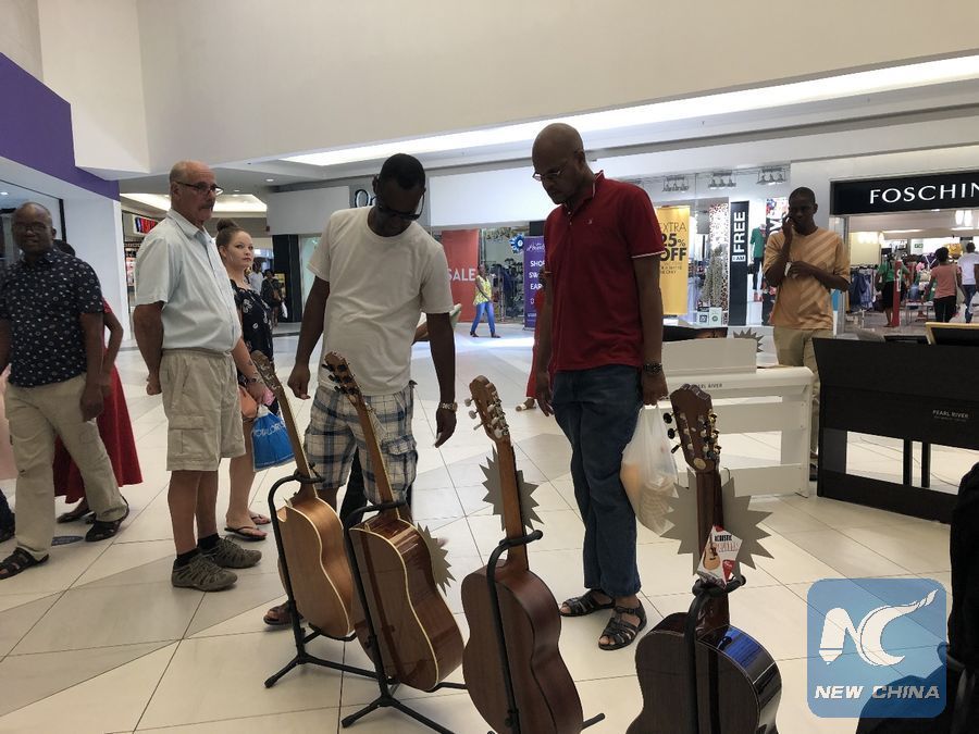 People look at musical instruments at an exhibition in Gaborone, capital of Botswana, Jan. 26, 2019. (Xinhua)