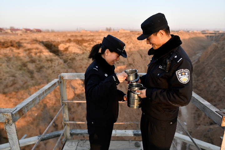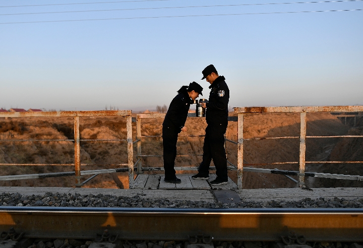 Railway policeman Gou Fawei (R) brings dumplings to his wife, policewoman Luo Yakun, on a railway bridge on the junction of the administrative areas by their two police stations when they patrol the railway line crossing Haiyuan County and its neighboringTongxin County in northwest China's Ningxia Hui Autonomous Region, Jan. 23, 2019. (Xinhua/Wang Peng)
