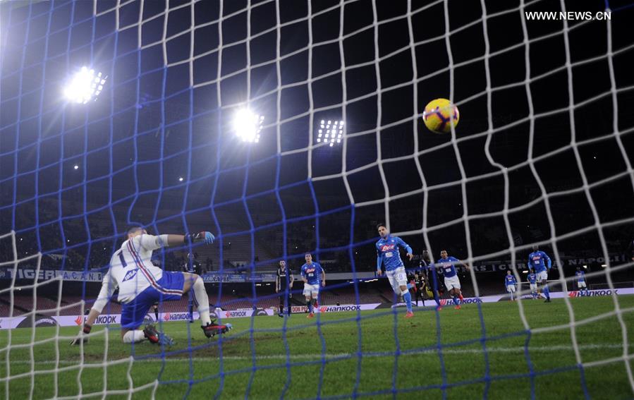 Napoli's Simone Verdi scores his goal during the Italian Serie A soccer match between Napoli and Sampdoria in Napoli, Italy, Feb. 2 , 2019. (Xinhua/Alberto Lingria)