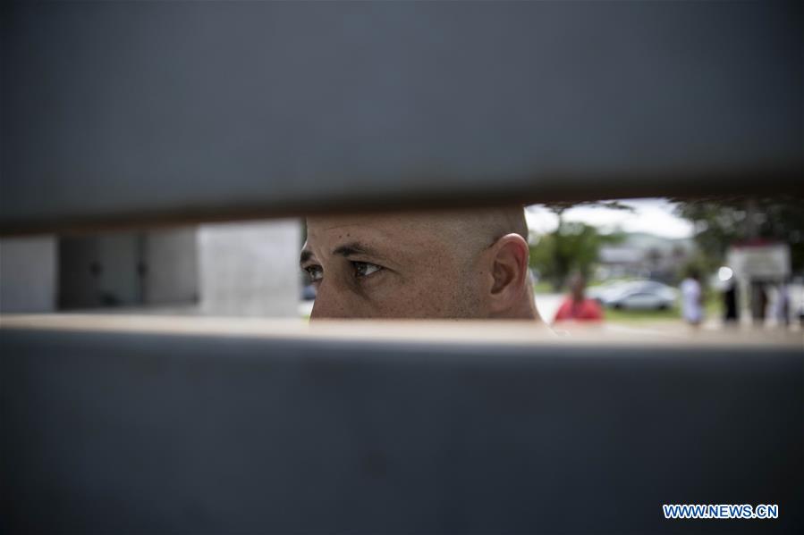 A working staff is seen at gate of the training center of Flamengo football club in Rio de Janeiro, Brazil, Feb. 8, 2019. At least 10 players were killed and three others injured early Friday morning when a fire swept through a training center at Flamengo football club in Rio de Janeiro, Brazil, the local fire department said. (Xinhua/Li Ming)