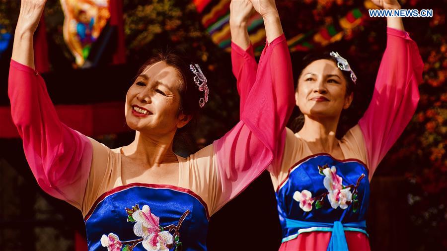 People from the Chinese American Citizens Alliance Dance Team perform to celebrate Chinese Lunar New Year at the Albuquerque Chinese Culture Center in Albuquerque of New Mexico, the United States, on Feb. 9, 2019. The celebration featured dragon and lion dances, tai chi demonstrations and kung fu exhibitions. (Xinhua/Richard Lakin)