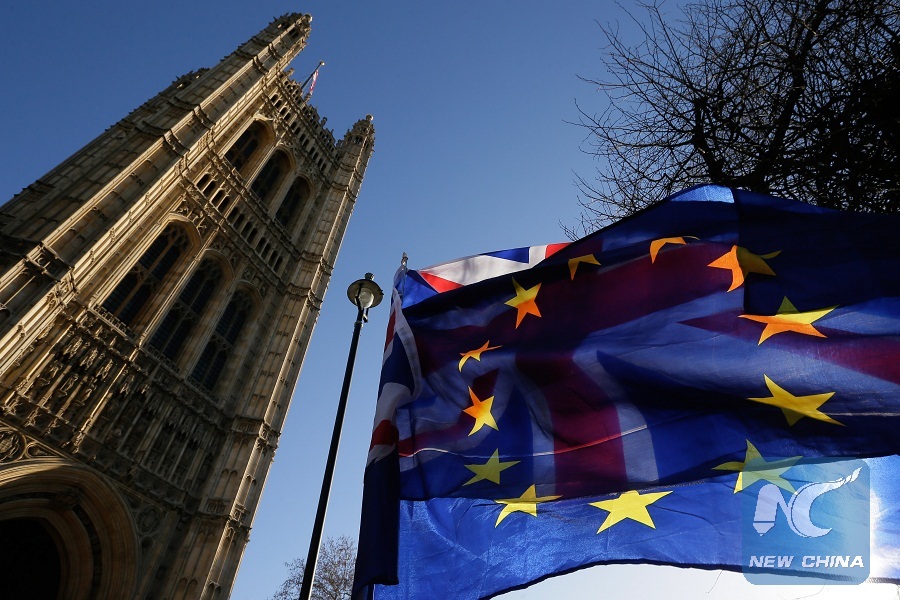 An EU flag is seen in front of a UK flag outside the Houses of Parliament in London, Britain, on Jan. 17, 2019. (Xinhua/Tim Ireland)