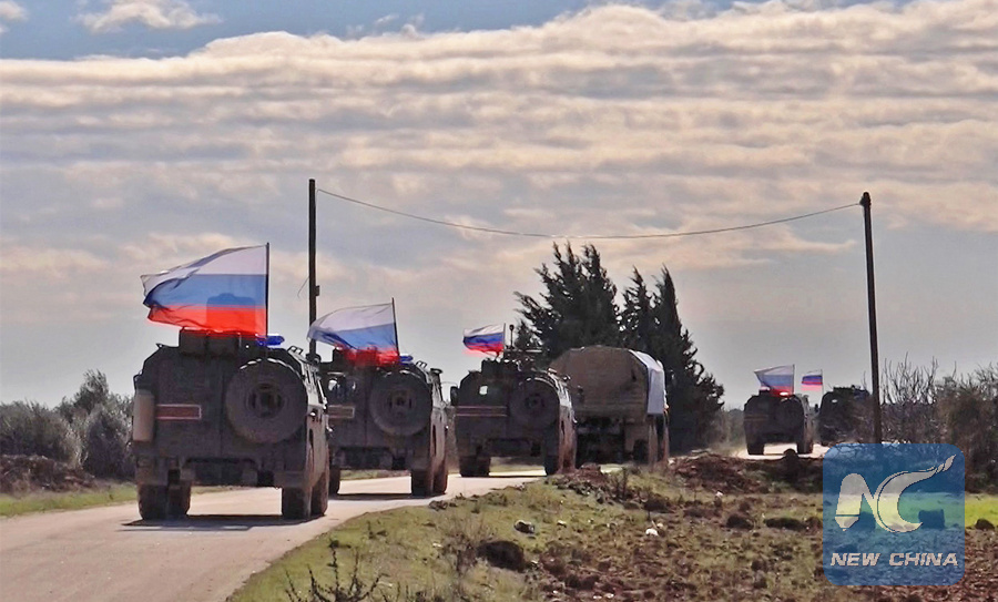 An image grab taken from AFP TV on January 17, 2019, shows Russian army vehicles on patrol in the area of Arimah, just west of Manbij, the northern city near the Turkish border. (AFP)