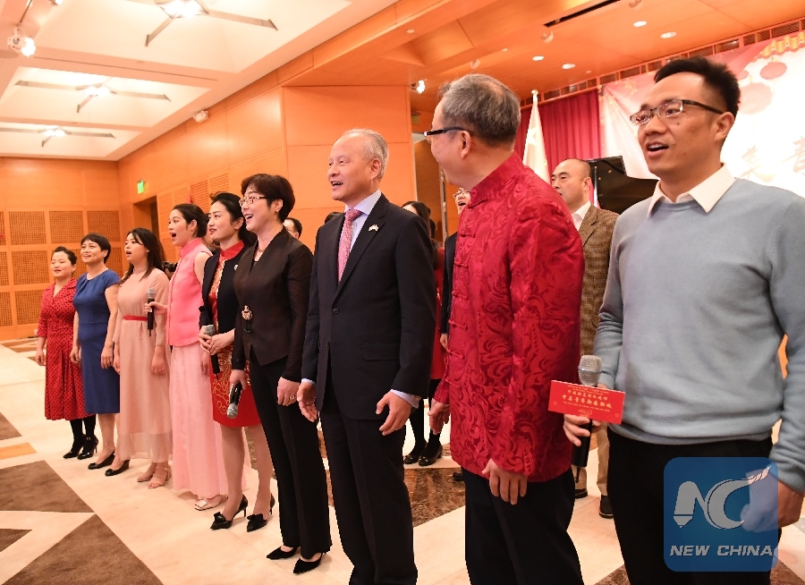 WASHINGTON, Feb. 17 (Xinhua) -- The silence was first broken by two singers, then four continued with the second line of lyrics, following which dozens of people joined in the chorus of the song "My motherland and I" in the hall of the Chinese embassy in Washington on Saturday.