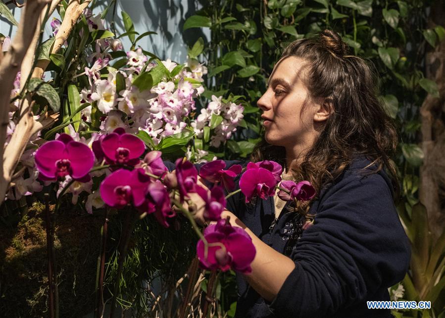 Assistant horticulturist Julia Zoltowsky arranges orchid flowers at the Orchid Show at the Chicago Botanic Garden in Glencoe, Illinois, the United States, on Feb. 21, 2019. The Orchid Show is held here from Feb. 9 to March 24. (Xinhua/Joel Lerner)
