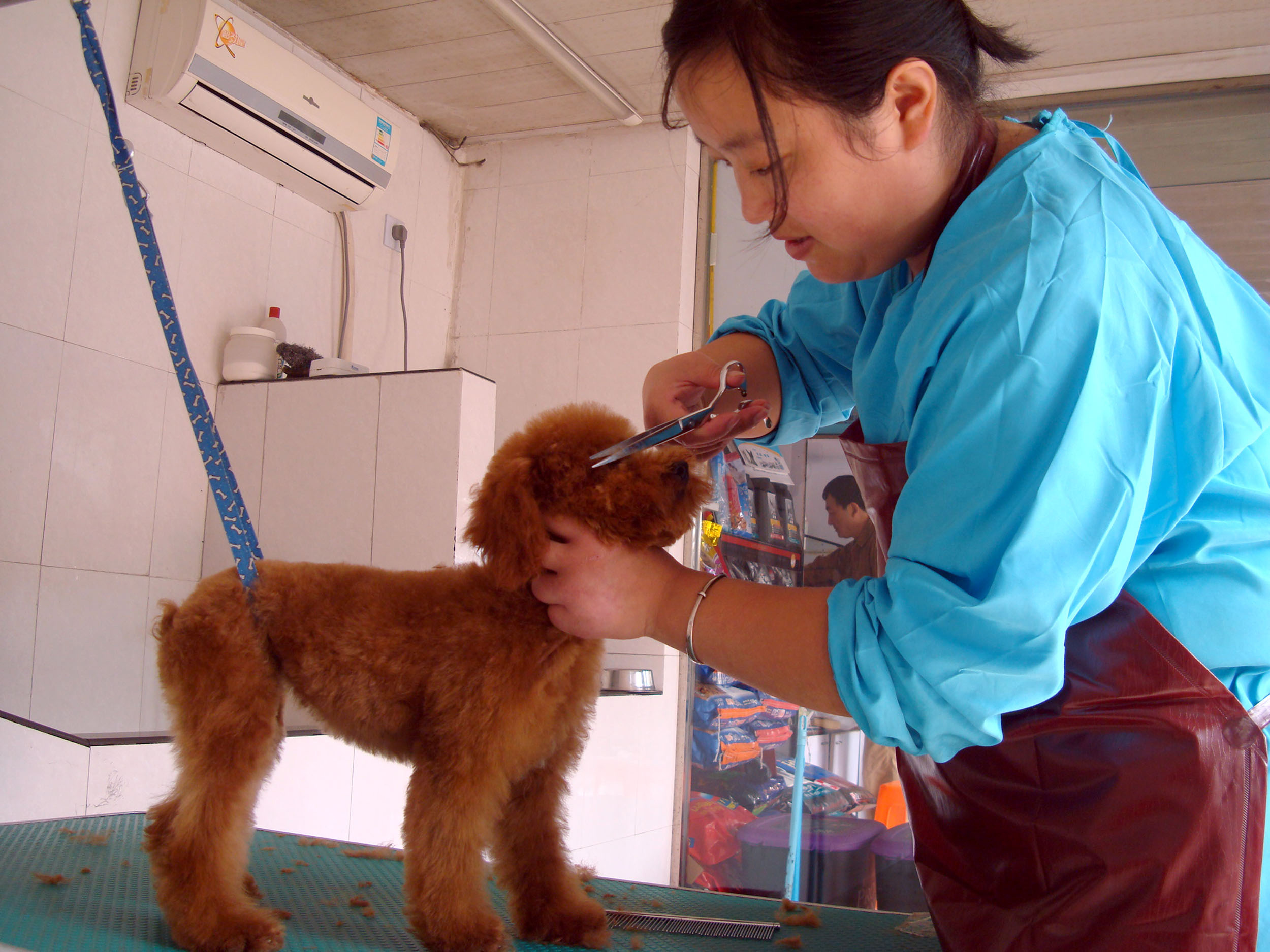 An employee cuts hair for a dog at a pet hotel in Suzhou, east China's Jiangsu Province. (Xinhua/Wang Jiankang)