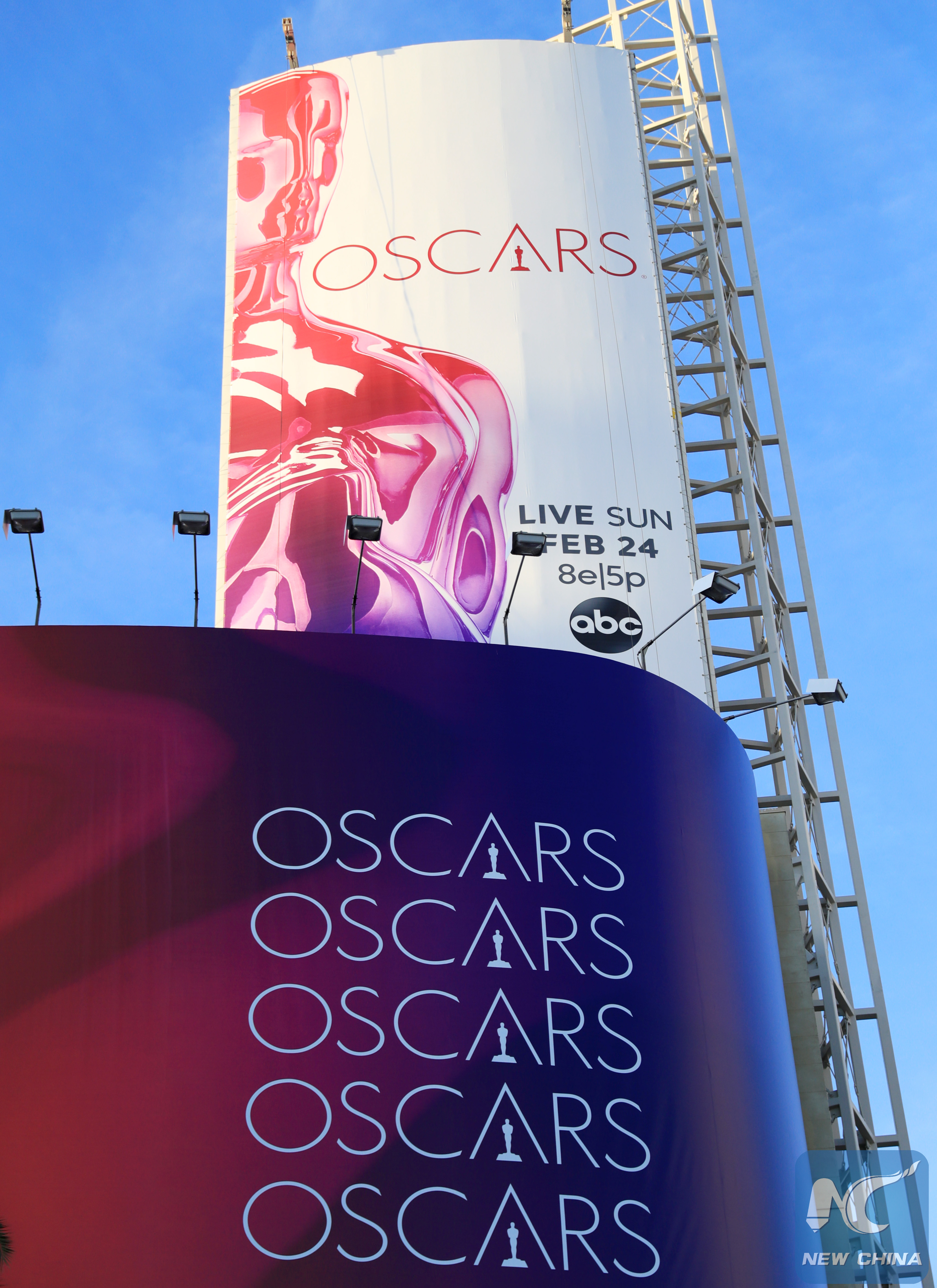 Posters of the upcoming Academy Awards ceremony, or Oscars, are seen at the Hollywood's Dolby Theatre in California, the United States, Feb. 23, 2019. (Xinhua/Li Ying)