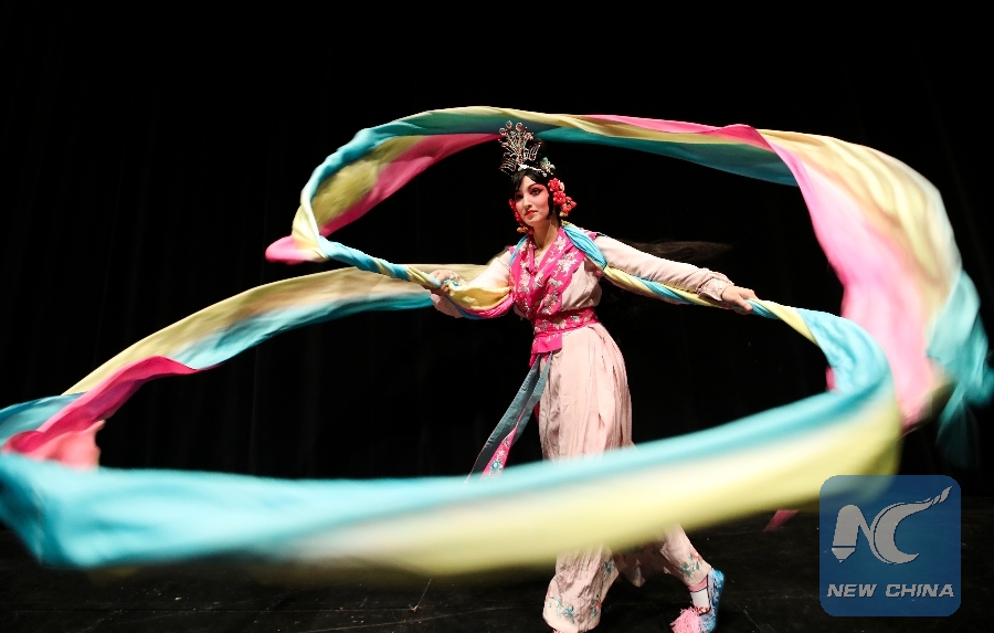 File Photo: Carrie Feyerabend dances with Shuixiu, literally Water Sleeves, one of the most skillful stunts in Peking Opera, during a rehearsal at Binghamton University (BU) in Binghamton, New York State, the United States, on Nov. 15, 2018. Feyerabend is one of the U.S. and Chinese artists from the Confucius Institute of Chinese Opera (CICO) at Binghamton University (BU) who were featured in the incredible show of the "Amazing Chinese Opera" in mid-November as the closing event of the university's International Education Week, an annual initiative to celebrate and promote international education and exchange. (Xinhua/Wang Ying)