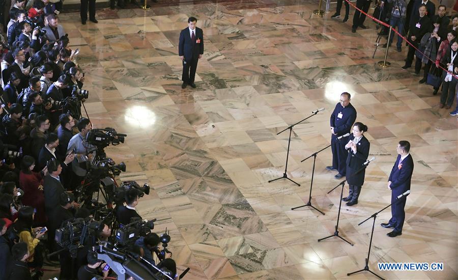 Shi Yigong, Song Jirong and Pan Biling (From R to L), members of the 13th National Committee of the Chinese People's Political Consultative Conference (CPPCC), receive an interview ahead of the opening of the second session of the 13th CPPCC National Committee at the Great Hall of the People in Beijing, capital of China, March 3, 2019. (Xinhua/Yan Yan)