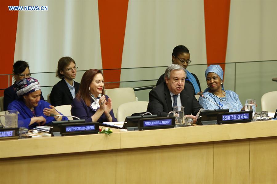 United Nations Secretary-General Antonio Guterres (2nd R, front), makes remarks for the observance of International Women's Day, at the UN headquarters in New York, March 8, 2019. Investing in women and respecting their human rights is the surest way to lift communities, companies and countries, and to achieve the 2030 Agenda for Sustainable Development, said the UN Secretary-General Antonio Guterres on Friday. (Xinhua/Li Muzi)