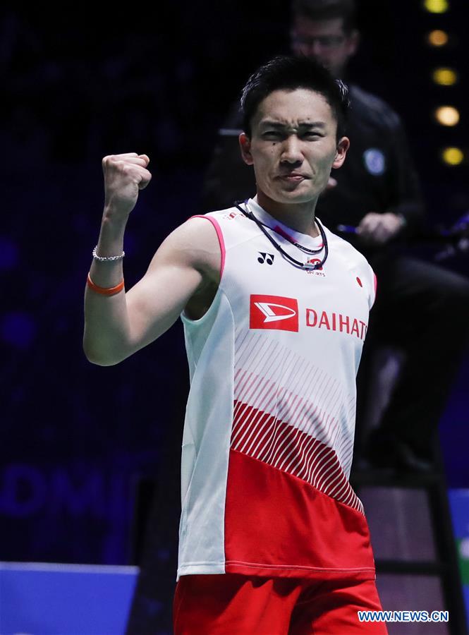 Japan's Kento Momota competes during the men's singles final match against Viktor Axelsen of Denmark at the All England Open Badminton Championships 2019 in Birmingham, Britain on March 10, 2019. Kento Momota won 2-1 to claim the title. (Xinhua/Han Yan)