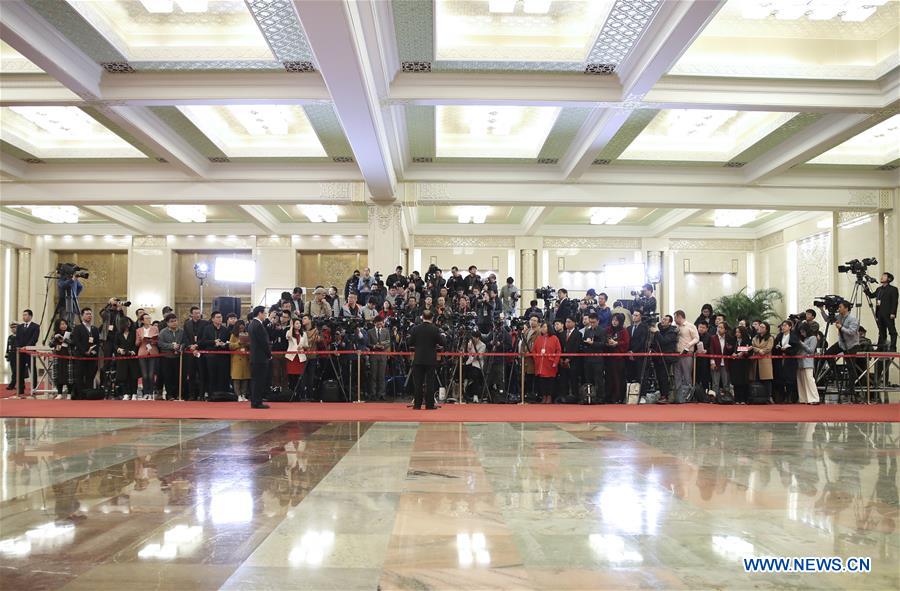 Journalists work at a group interview with ministers before the third plenary meeting of the second session of the 13th National People's Congress of China at the Great Hall of the People in Beijing, capital of China, March 12, 2019. (Xinhua/Jin Liwang)