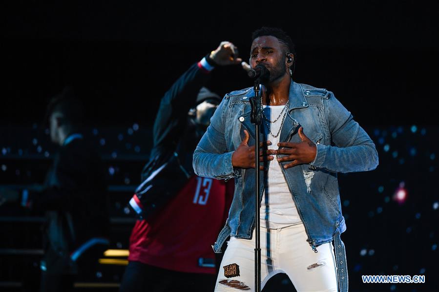 American singer Jason Derulo performs during the draw ceremony of 2019 FIBA Basketball World Cup in Shenzhen, south China's Guangdong Province, March 16, 2019. (Xinhua/Mao Siqian)