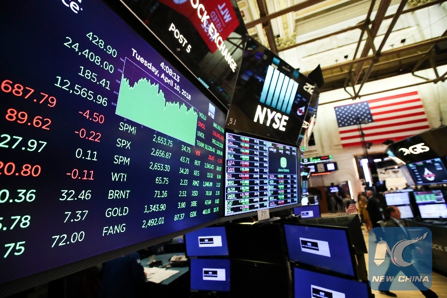 File Photo: An electronic screen showing indexes is seen at the New York Stock Exchange in New York, the United States, on April 10, 2018. (Xinhua/Wang Ying)