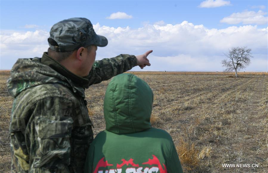 Shuanglong, a man of Mongolian ethnic group, and his son look at a newly-built nest of upland buzzard on their way to the Hulun Lake in New Barag Right Banner of the Hulun Buir City, north China's Inner Mongolia Autonomous Region, April 13, 2019. Shuanglong, a volunteer born in the 1980s, has been dedicated to protecting wildlife inhabiting along the Hulun Lake over the past ten years. Over 40 endangered animals have been saved through his efforts. Shuanglong has organized various activities including photo exhibitions and lectures, as a way to raise awareness of wildlife protection among the public. Affected by Shuanglong, some volunteers also joined him to protect wildlife along the Hulun Lake. (Xinhua/Peng Yuan)