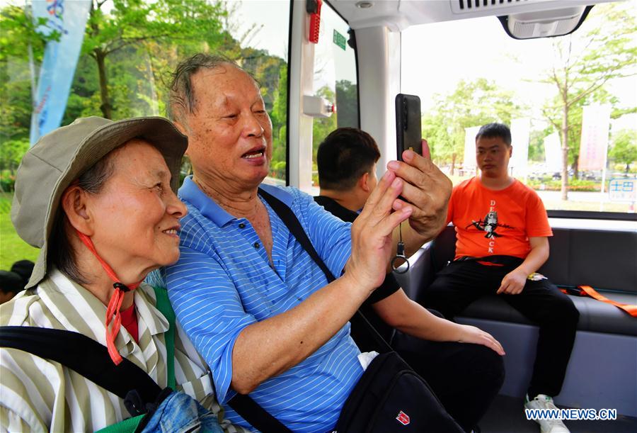 Passengers sit in a self-driving bus running on a sight-seeing path in the Feifeng Moutain smart park in Fuzhou, capital of southeast China's Fujian Province, April 24, 2019. The Feifeng Mountain smart park, the first AI park of Fujian province, opened in Fuzhou recently. (Xinhua/Wei Peiquan)