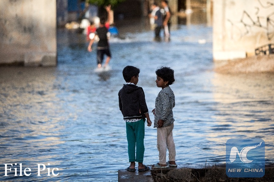 Children stand beside flood water at a village in Khuzestan Province, southwestern Iran, on April 10, 2019. (Xinhua File photo)
