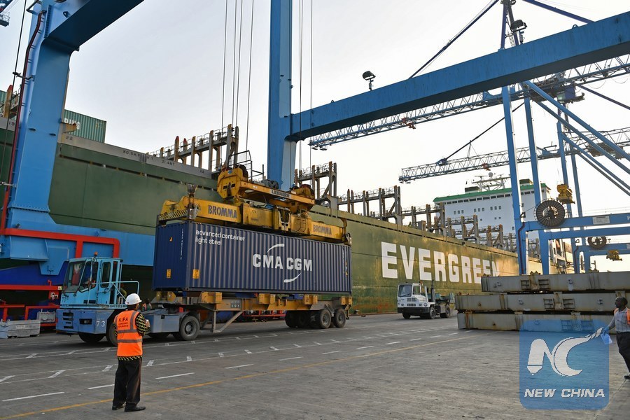 A container is unloaded from a ship at the 19th berth in Mombasa Port, Mombasa, Kenya, Jan. 9, 2017. Being East Africa's largest port, Mombasa port serves as an important logistic hub in the region, transporting containers to Tanzania, Uganda, South Sudan, Rwanda, Burundi and etc. China helped with its 19th berth expansion project which significantly improved the port's operational efficiency. Together with the under constructing Standard Gauge Railway which will connect Mombasa Port with Kenya's capital Nairobi, the port will help develop the economy of this country as well as the whole East Africa. (Xinhua/Sun Ruibo)