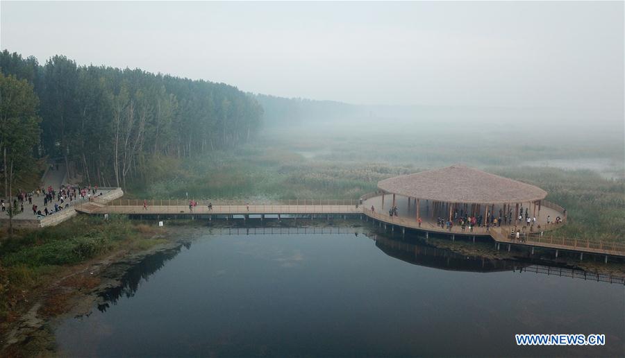 Aerial photo taken on Oct. 1, 2017 shows people doing morning exercises at the Wenyuan Pavilion at the bank of the Baiyangdian lake in Xiongan New Area, north China's Hebei Province. (Xinhua/Chen Yehua)