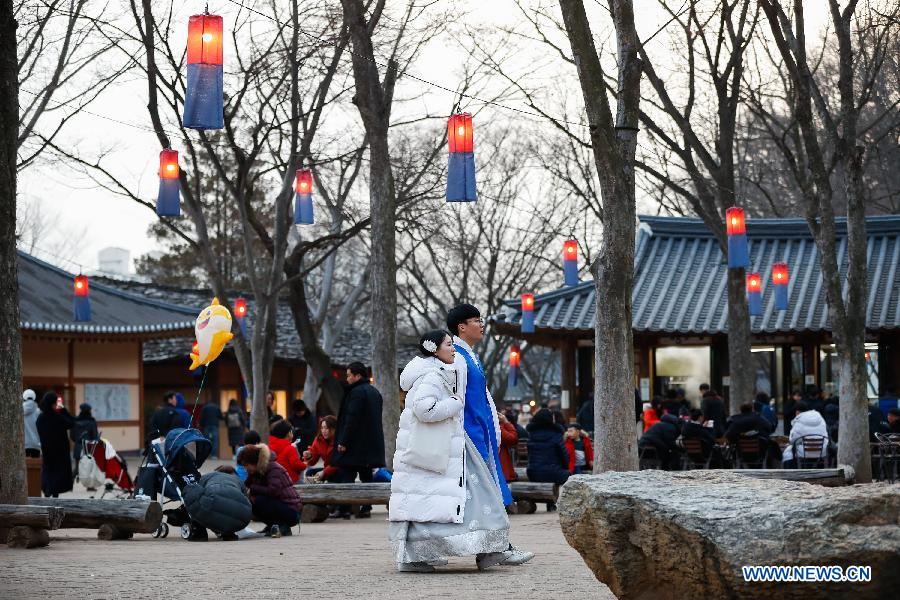 Tourists dressed in traditional costume visit a folklore-themed village in Yongin, South Korea, Feb. 5, 2019. China will hold the Conference on Dialogue of Asian Civilizations starting from May 15. Under the theme of "exchanges and mutual learning among Asian civilizations and a community with a shared future," the conference includes an opening ceremony and sub-forums. (Xinhua/Wang Jingqiang)