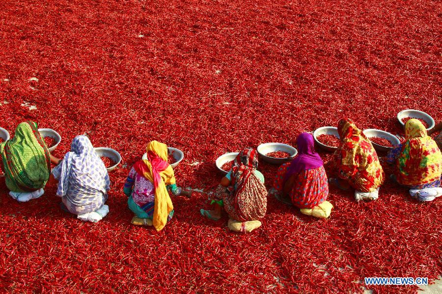 Women dry chilies at a factory in Bogra district, Bangladesh, March 23, 2019. China will hold the Conference on Dialogue of Asian Civilizations starting from May 15. Under the theme of "exchanges and mutual learning among Asian civilizations and a community with a shared future," the conference includes an opening ceremony and sub-forums. (Xinhua)