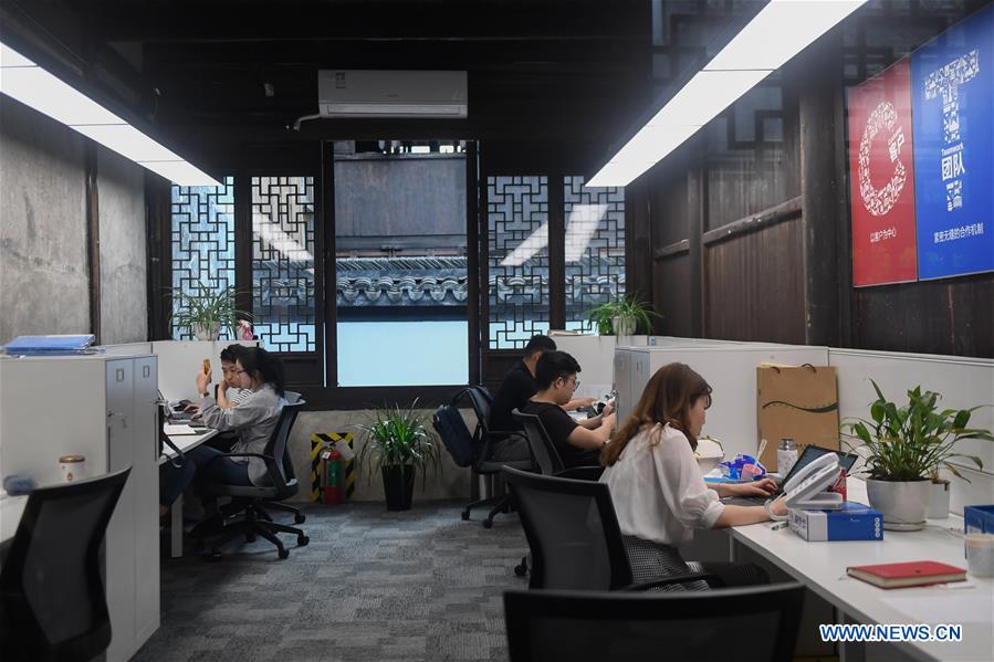 People work at a company at Xiaoxijie historical and cultural block in Wuxing District of Huzhou City, east China's Zhejiang Province, May 21, 2019. Efforts has been made in the district to transform Xiaoxijie historical and cultural block into a modern zone for cultural and creative industries, arts, and businesses. (Xinhua/Huang Zongzhi)
