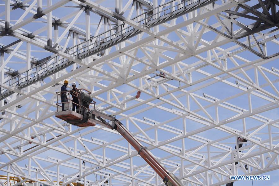 Workers are seen at the construction site of the Zhangjiakou Station of the Beijing-Zhangjiakou high-speed railway in Zhangjiakou, north China's Hebei Province, May 30, 2019. The main structure of the Zhangjiakou Station has been basically completed. (Xinhua/Xing Guangli)
