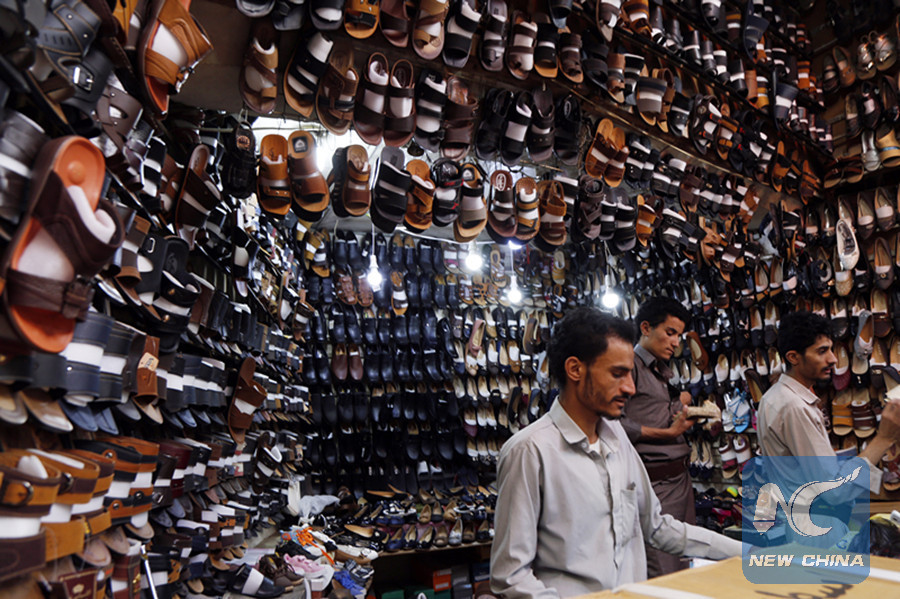 A vendor displays new shoes for sale ahead of the Eid al-Fitr at a market in Sanaa, Yemen, June 1, 2019. (Xinhua/Mohammed Mohammed)