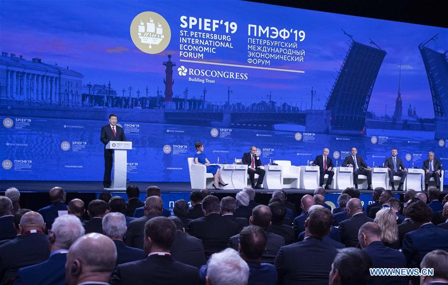 Chinese President Xi Jinping (1st L) addresses the plenary session of the 23rd St. Petersburg International Economic Forum (SPIEF) held in St. Petersburg, Russia, June 7, 2019. Xi Jinping on Friday attended the plenary session of the 23rd SPIEF along with Russian President Vladimir Putin, Bulgarian President Rumen Radev, Armenian Prime Minister Nikol Pashinyan, Slovak Prime Minister Peter Pellegrini, United Nations Secretary-General Antonio Guterres and other guests. (Xinhua/Li Tao)