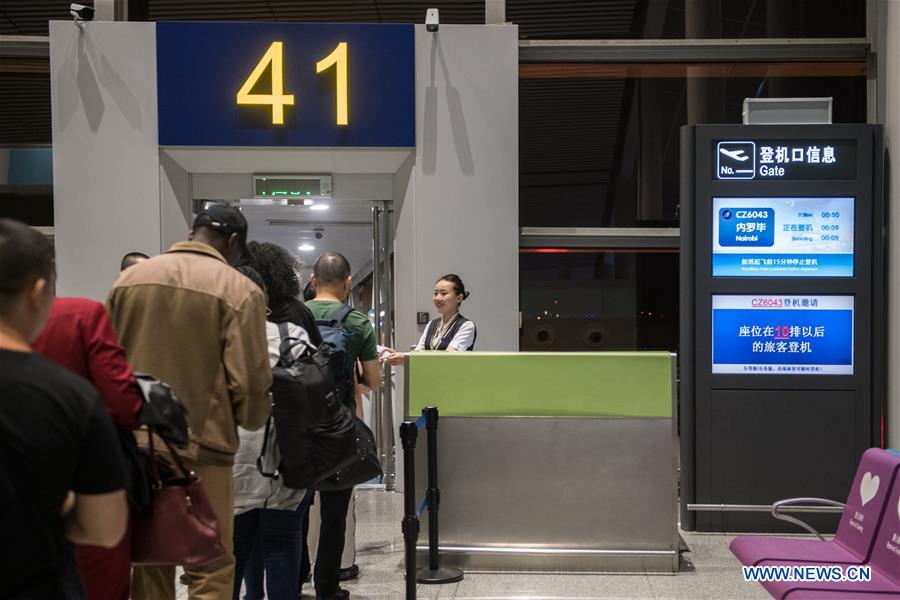 People queue up to board flight CZ6043 at Changsha Huanghua International Airport in Changsha, central China's Hunan Province, June 12, 2019. An air route was launched Wednesday to link Changsha, capital city of central China's Hunan Province, with Nairobi, capital of Kenya, the operator said. Operated by China Southern Airlines with an Airbus 330, the outbound flight departed Changsha Huanghua International Airport at around 1 a.m. in Changsha. (Xinhua/Chen Sihan)