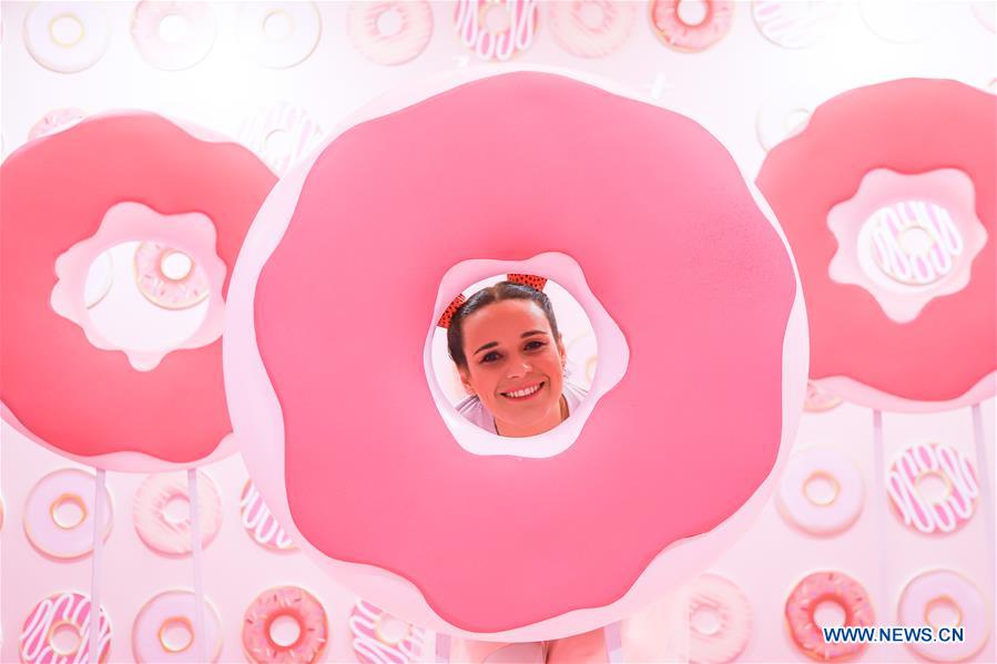 A woman poses for photos at the "Sweet Art Museum" installation art exhibition in Sao Paulo, Brazil, June 19, 2019. (Xinhua/Rahel Patrasso)