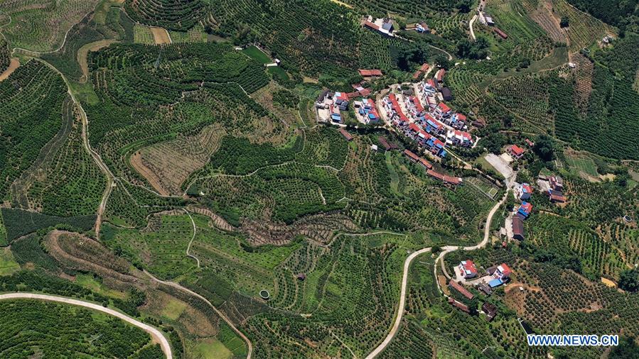 Aerial photo taken on June 20, 2019 shows a view of the mandarin orchard at Puhe Township in Xilin County, south China's Guangxi Zhuang Autonomous Region. Xilin County is a poverty-stricken county in the westernmost part of Guangxi. Local authority has promoted fruits and tea planting here to boost local residents' income. (Xinhua/Zhang Ailin)