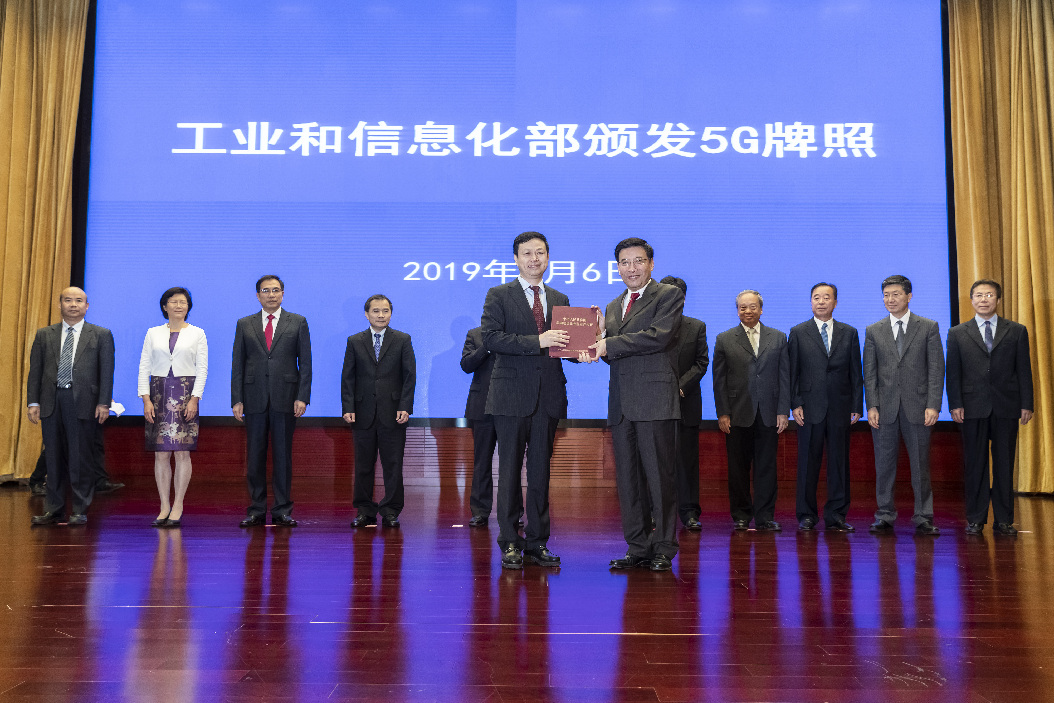 China's Industry and Information Technology Minister Miao Wei (R) grants a 5G license for commercial use to Yang Jie, chairman of China Mobile, in Beijing, capital of China, on June 6, 2019. (Xinhua/Shen Bohan)