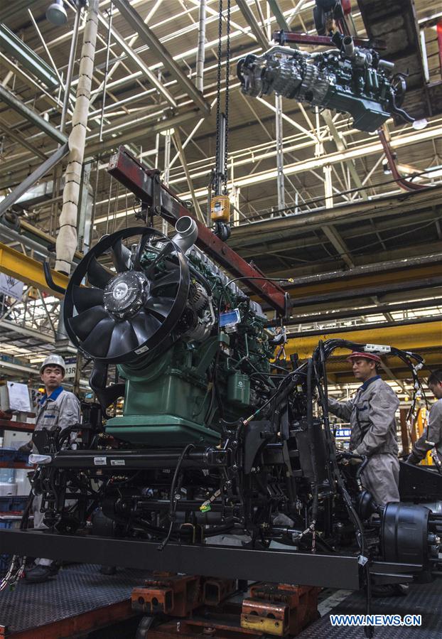 Staff members install an engine at a Jiefang truck plant of China's First Automobile Workshop (FAW) in Changchun, northeast China's Jilin Province, June 12, 2019. China's leading automaker FAW Group has made a dent in a series of "surgical reforms" related to its personnel system and brand reconstruction. (Xinhua/Xu Chang)