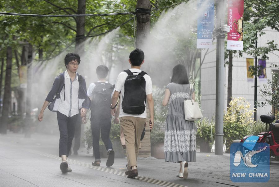 Pedestrians walk past mist blowers on the street in Tokyo, Japan on August 5, 2018. (Xinhua/Du Xiaoyi)