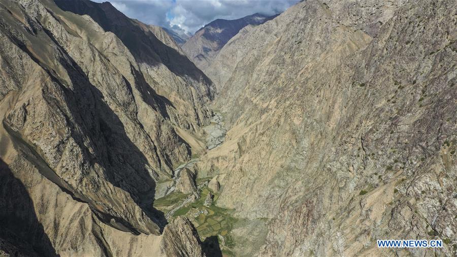 Aerial photo taken on June 20, 2019 shows the a herding path in a river valley leading to the Laybulaq pasture in Datong Township, Taxkorgan Tajik Autonomous County of northwest China's Xinjiang Uygur Autonomous Region. The Laybulak pasture lies in the heartland of the Pamir Plateau in northwest China at around 3,700 meters above sea level, which is a major summer pasture for the nomads of Aktogar Langgar Village. Previous every summer, the poverty-stricken family of Ezibek Yusupbek went to the Laybulak pasture for herding, which used to be a major source of the family's income. Thanks to local government's subsidy measures and pension policy, the income from herding has taken less proportion in Ezibek Yusupbek family's annual income at present. They are also funded by a resettlement house in urban area from government to help them to get rid of poverty. Nowadays the family of Ezibek Yusupbek has been striving to improve their life through herding for themselves and other people. (Xinhua/Hu Huhu)