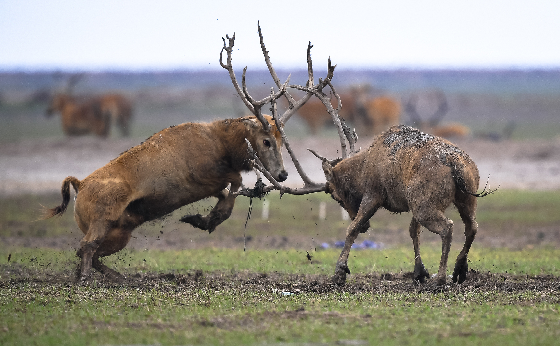 Two male milu deer, also known as Pere David's deer, fight in Dafeng Milu National Nature Reserve in east China's Jiangsu Province, June 27, 2019. (Xinhua/Li Xiang)