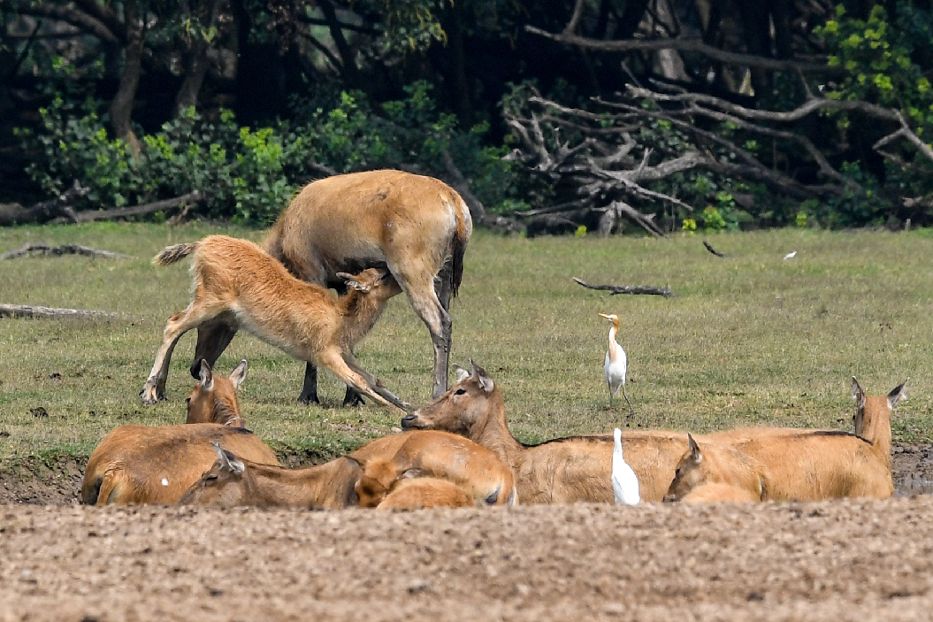 A female milu deer feeds her baby born in this year in Dafeng Milu National Nature Reserve in east China's Jiangsu Province, June 28, 2019. (Xinhua/Li Bo)
