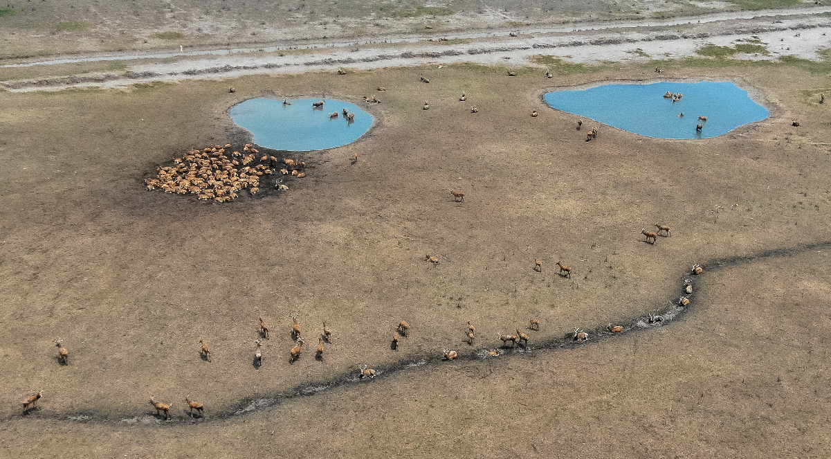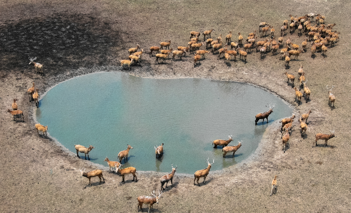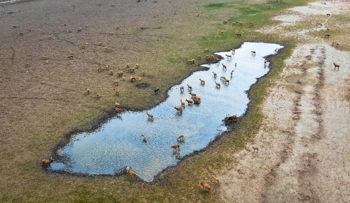 Aerial photo taken on June 27, 2019 shows milu deer gathering around a pond in Dafeng Milu National Nature Reserve in east China's Jiangsu Province. (Xinhua/Li Xiang)