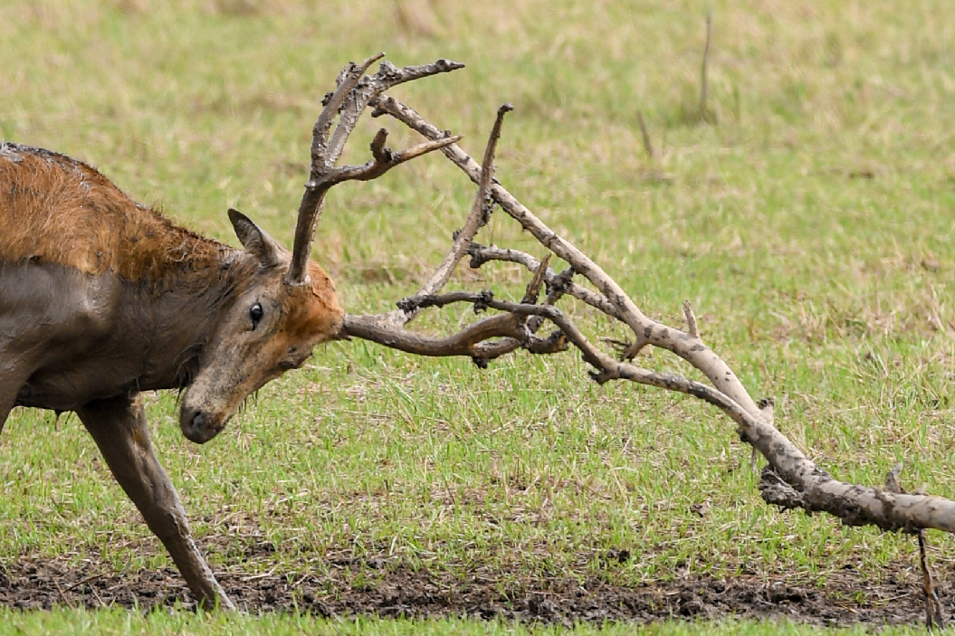 A male milu deer polishes its antlers in Dafeng Milu National Nature Reserve in east China's Jiangsu Province, June 27, 2019. (Xinhua/Li Bo)